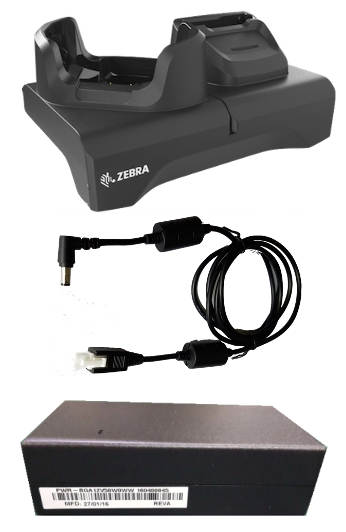 Single-slot and spare battery charging cradle kit with USB communication / Ethernet capability for TC53 / TC58, TC53e / TC58e / TC53e-RFID. Includes power supply (PWR-BGA12V50W0WW), DC cable (CBL-DC-388A1-01), and shims (SHIM-CRD-NGTC5). Country-specific AC cable is sold separately.